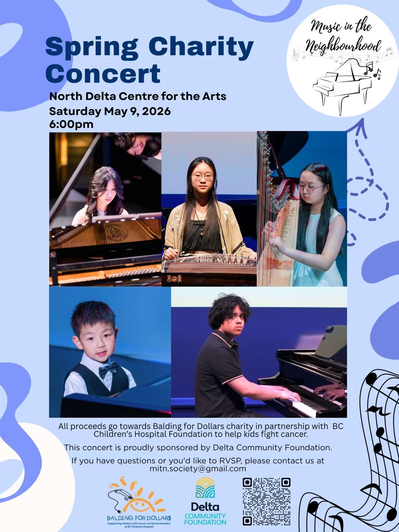 We are a music concert based out of North Delta that is performed by the children and youth of the Delta and Lower Mainland community. We feature a variety of instruments, including the piano, violin, viola, and harp. Our concert is non-profit; however, we ask for donations through our audience. All of our proceeds go towards the “Balding for Dollars” charity, which runs in partnership with the BC Children’s Hospital Foundation. Its funding is dedicated solely to the oncology department of BCCH to help kids and their families fight cancer.
